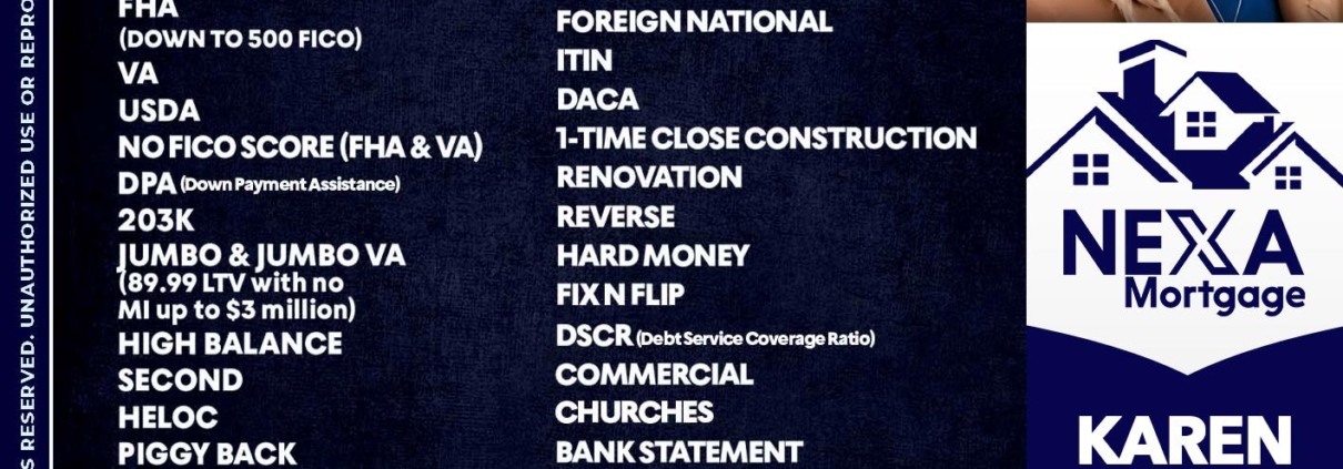 Hi, my name is Karen Zuccaro. I’m a Loan Officer with NEXA Mortgage LLC., offering personalized mortgage solutions, fast customized quotes, great rates and service with integrity.