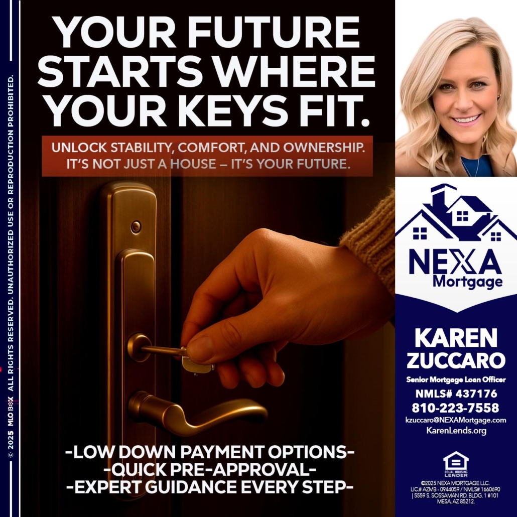 YOUR FUTURE - Karen Zuccaro -Senior Mortgage Loan OfficerHi, my name is Karen Zuccaro. I’m a Loan Officer with NEXA Mortgage LLC., offering personalized mortgage solutions, fast customized quotes, great rates and service with integrity.